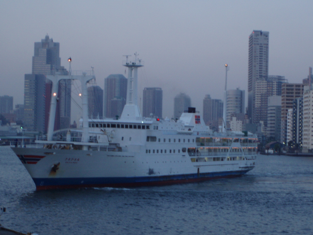 都会の夕景が好きだ。船は舵を切って、向きを変えていく。(竹芝桟橋)